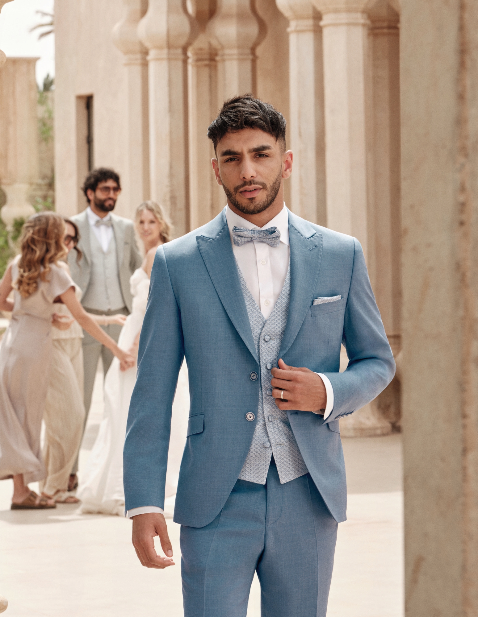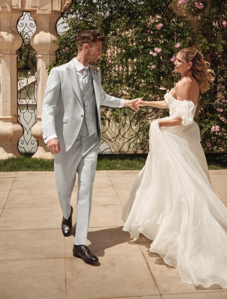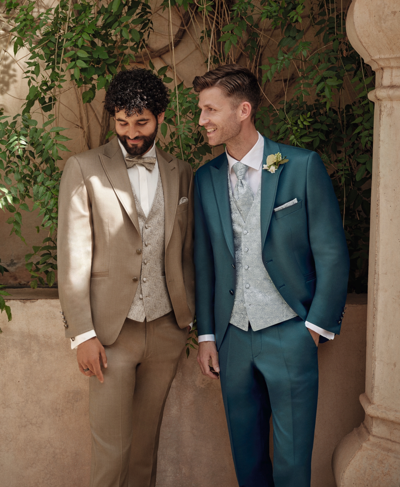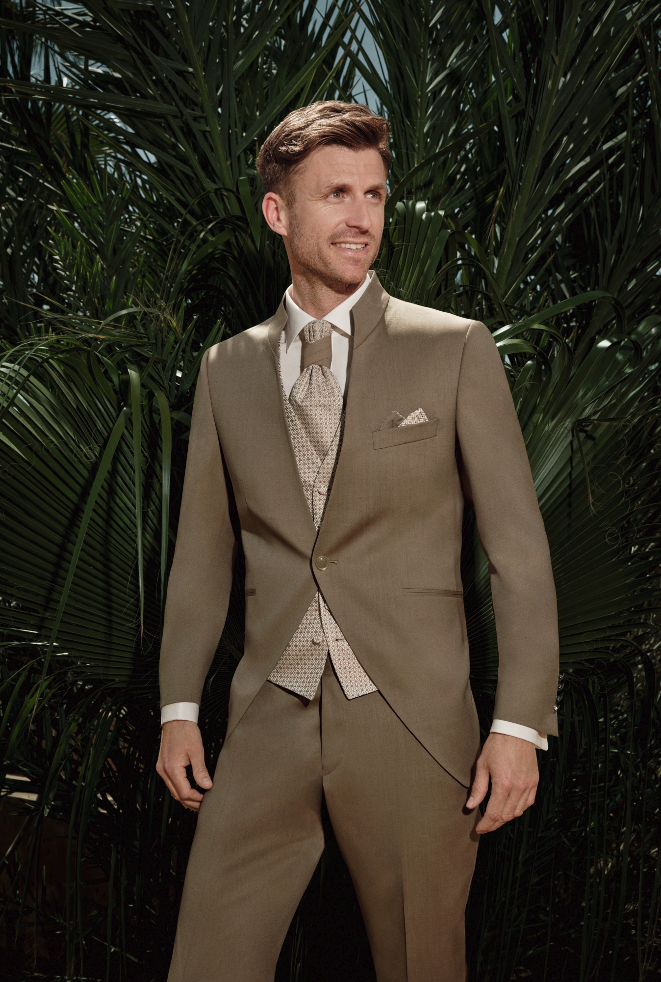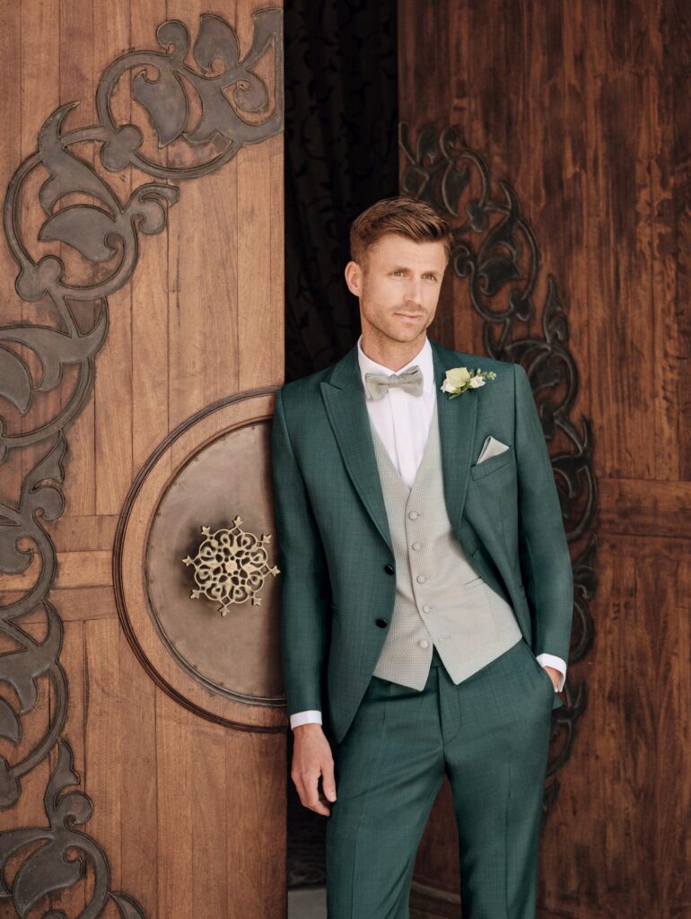Nowe motywy kolorystyczne — przede wszystkim różne odcienie zieleni oraz średnie i jasne tony błękitu — są nieodzownym elementem garniturów ślubnych na rok 2026. Uzupełnieniem są barwy z gamy czerwieni — kruche, ziemiste, wyraziste. Znany i ceniony krój Drop 8, dostępny teraz w miękkim, komfortowym wykończeniu, łączy w sobie formalny charakter z lekkością i swobodą. Nowoczesne fasony z klapami w szpic oraz eleganckie marynarki ze stójką tworzą trzon tej kolekcji.