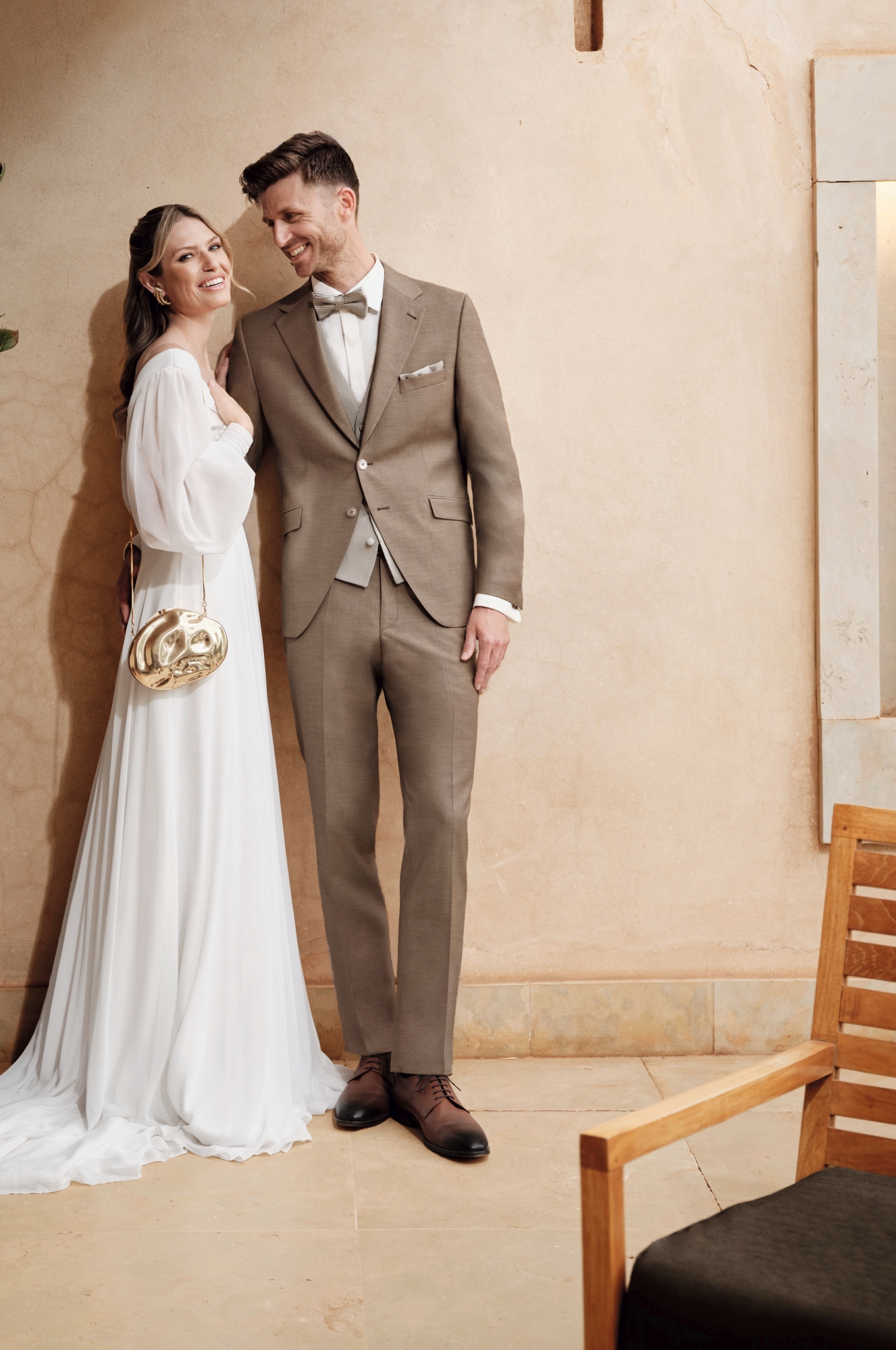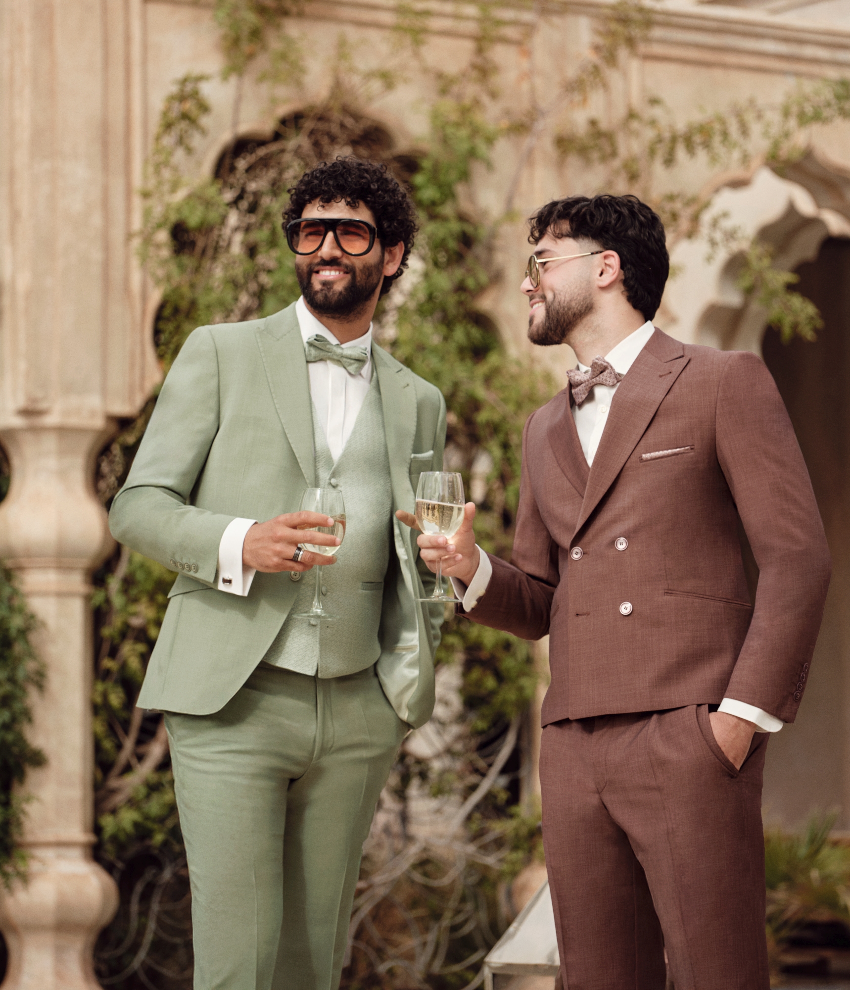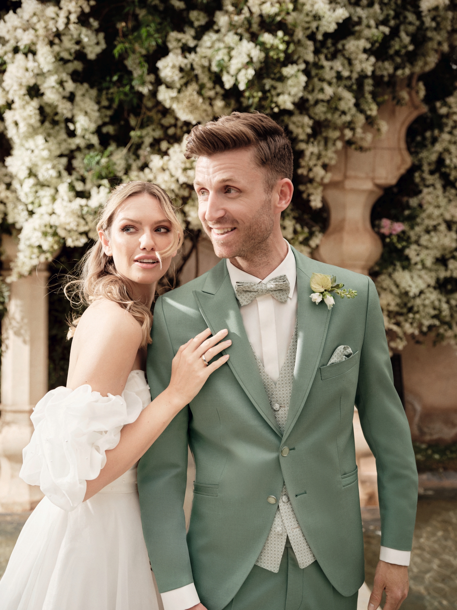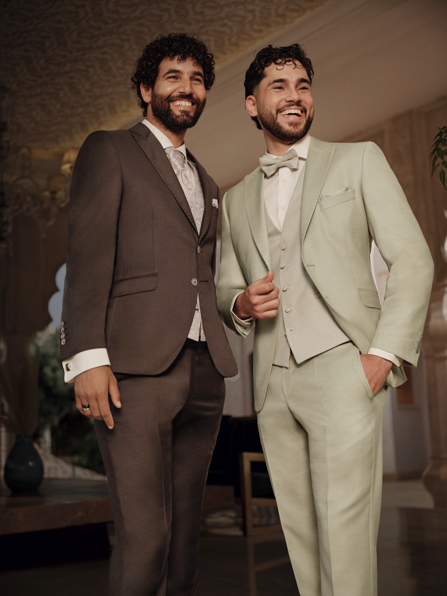 Nowe motywy kolorystyczne — przede wszystkim różne odcienie zieleni oraz średnie i jasne tony błękitu — są nieodzownym elementem garniturów ślubnych na rok 2026. Uzupełnieniem są barwy z gamy czerwieni — kruche, ziemiste, wyraziste. Znany i ceniony krój Drop 8, dostępny teraz w miękkim, komfortowym wykończeniu, łączy w sobie formalny charakter z lekkością i swobodą. Nowoczesne fasony z klapami w szpic oraz eleganckie marynarki ze stójką tworzą trzon tej kolekcji.